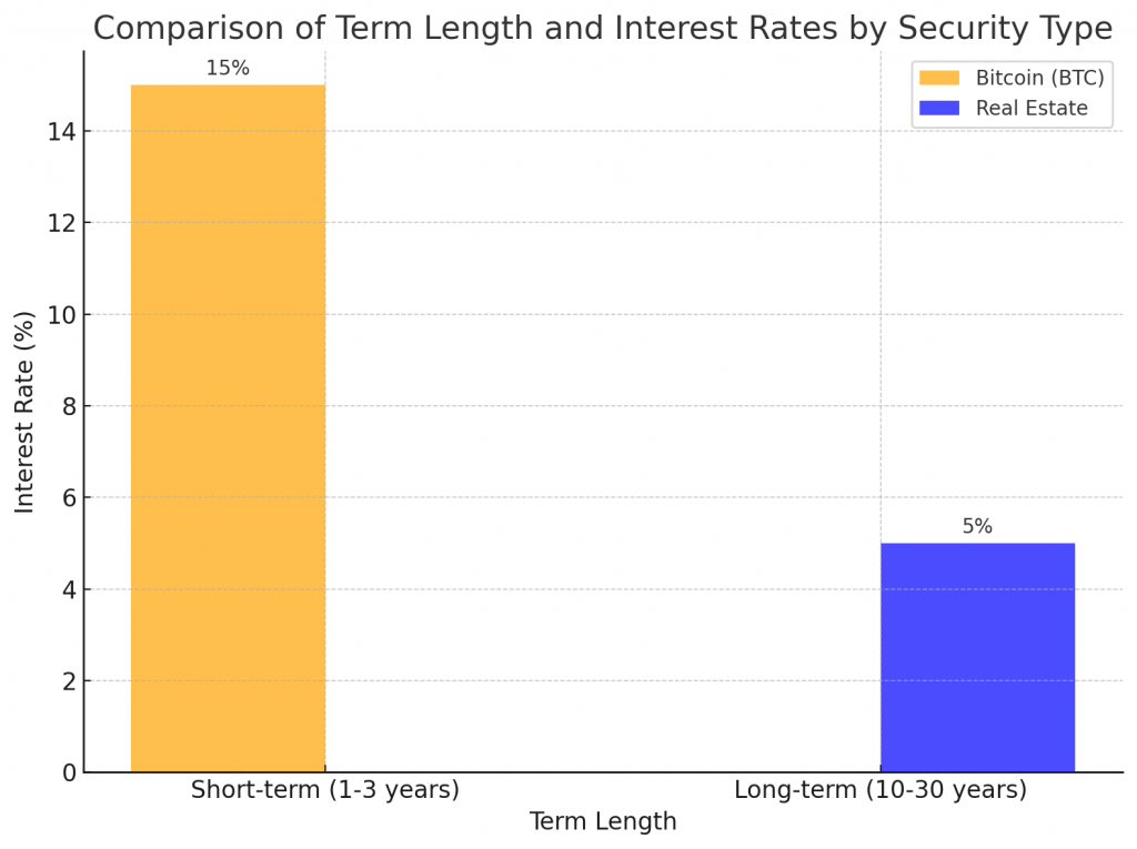 Here is a bar chart comparing interest rates for loans secured by Bitcoin (BTC) and real estate based on term lengths: