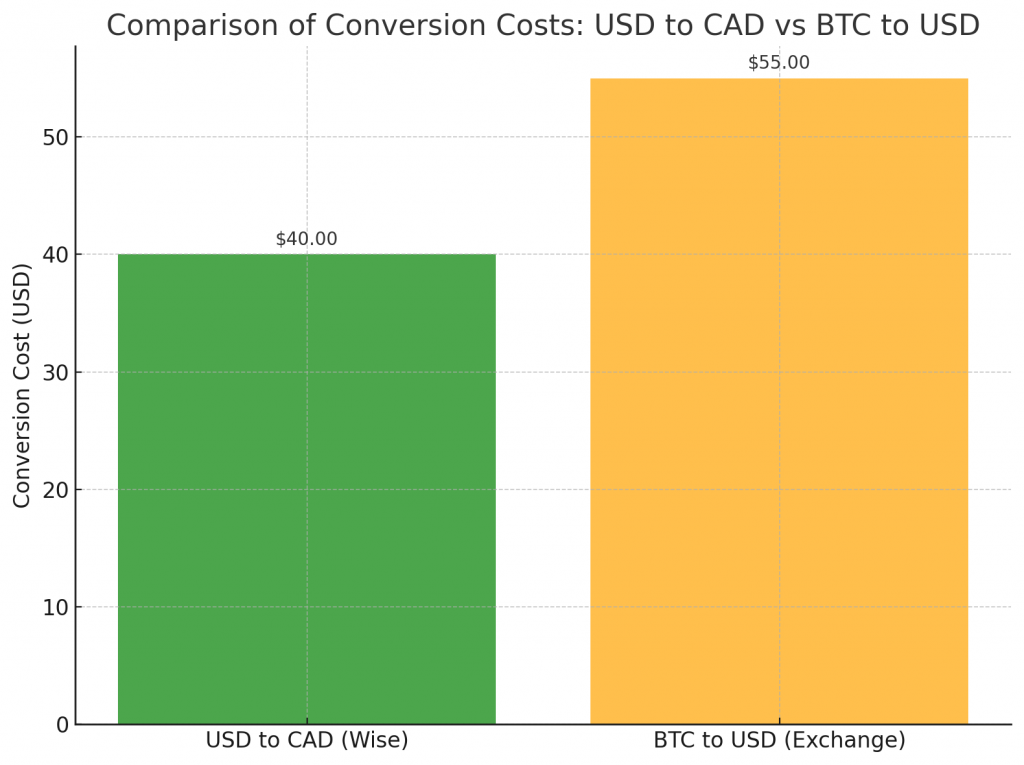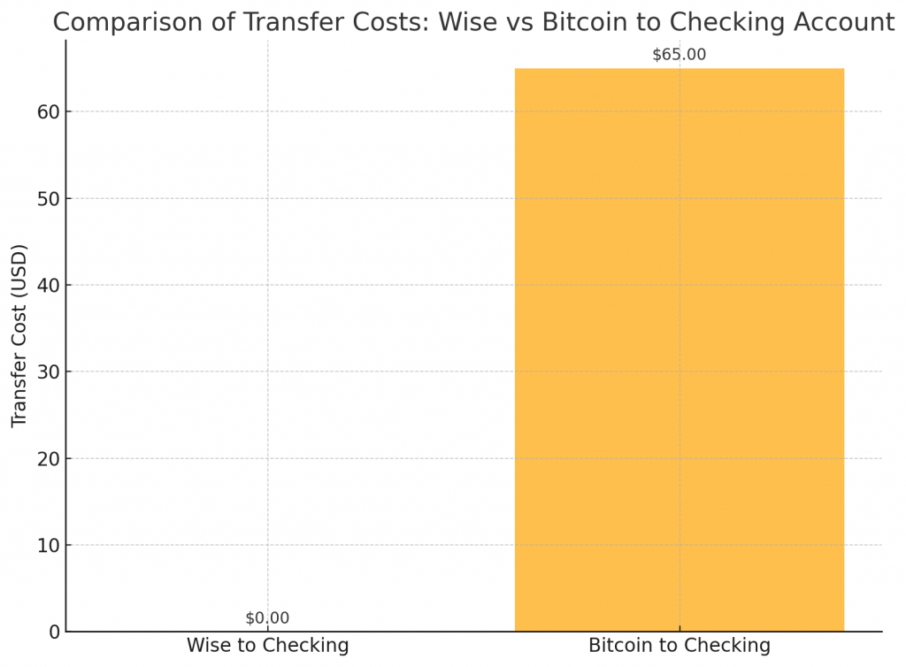 This highlights that Wise offers a more cost-effective option for domestic fiat transfers, while Bitcoin incurs higher costs due to exchange and network fees. Let me know if you’d like further details or refinements!